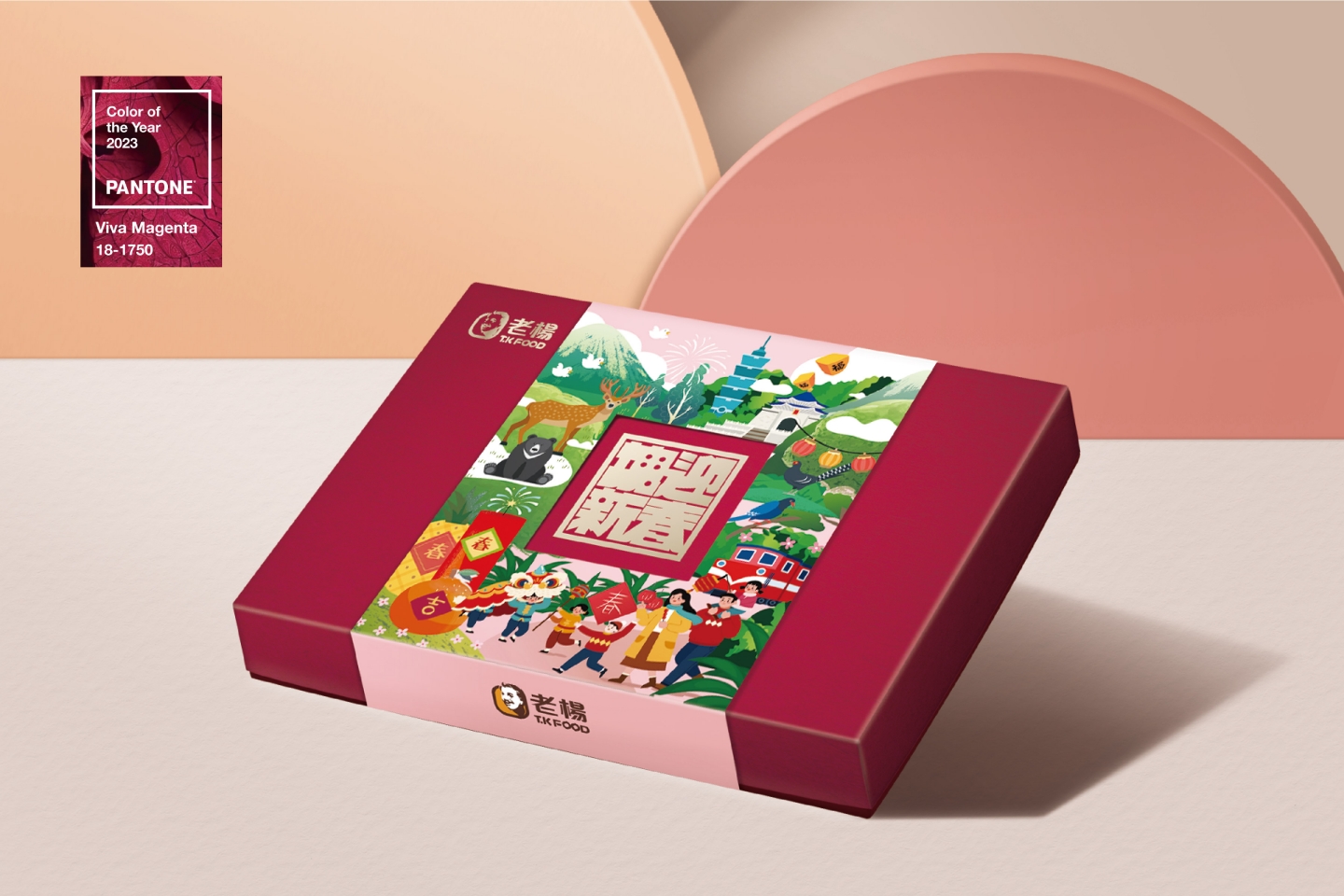 整體禮盒主色使用Pantone所選出的2023年度代表色「Viva Magenta萬歲洋紅」,顯眼卻不過於霸道,也代表生機勃勃之意。主形象以直接的方式呈現台灣特色意象,充分展現美麗寶島的人文風景與歡愉的年節氛圍。封套部分開窗透出裱紙上的燙金,讓禮盒顯得大方喜氣。